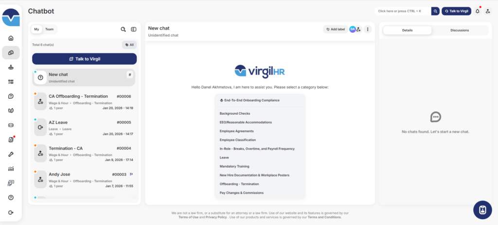 VirgilHR’s Chatbot delivers real-time, attorney-backed answers to everyday HR and compliance questions across all 50 states. Embedded directly into your workflow, the chatbot provides clear, defensible guidance employees and HR teams can trust—reducing risk, saving time, and eliminating guesswork.