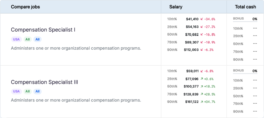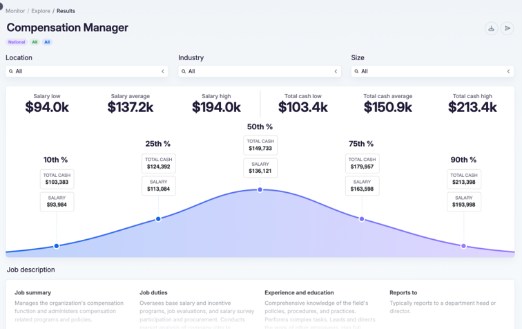 Access real-time salary data across roles, industries, and locations—all in one platform. Compare base pay, bonuses, and total compensation for any position, helping your team make data-backed decisions with clarity.