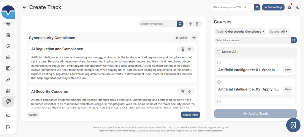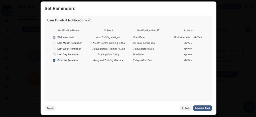Build, schedule, and assign tracks with multiple courses in minutes. Confirm assignments, track progress, and ensure employees complete required training on time.