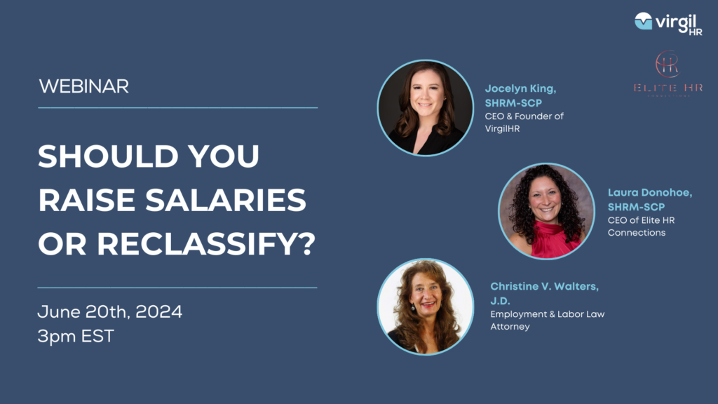 Should You Raise Salaries or Reclassify? VirgilHR’s CEO, Jocelyn King, SHRM-SCP, along with Laura Donohoe, SHRM-SCP, CEO of EliteHRConnections, and ... Read More